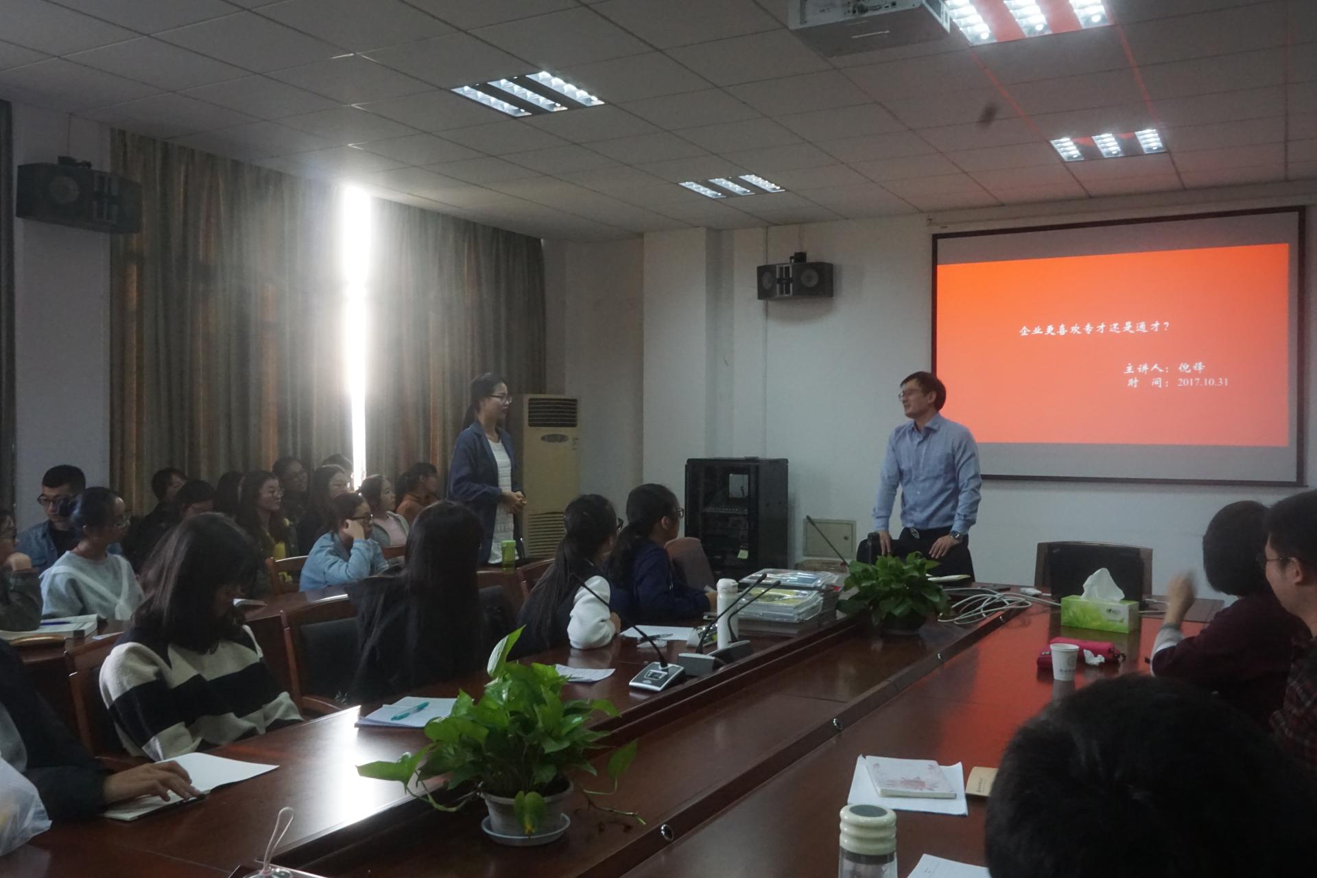 10月31日下午,浙江财经大学英华正茂——做人做事系列讲座(No.1)暨国际商务硕士(MIB)企业家讲座系列活动(No.20)在环球360管理系统入口313教室举行。江苏明德玩具股份有限公司副总经理兼董事会秘书倪锋先生为17级国贸英华班本科新生和国际贸易与国际商务专业的研究生新生作了主题为“企业更喜欢专才还是通才”的讲座。