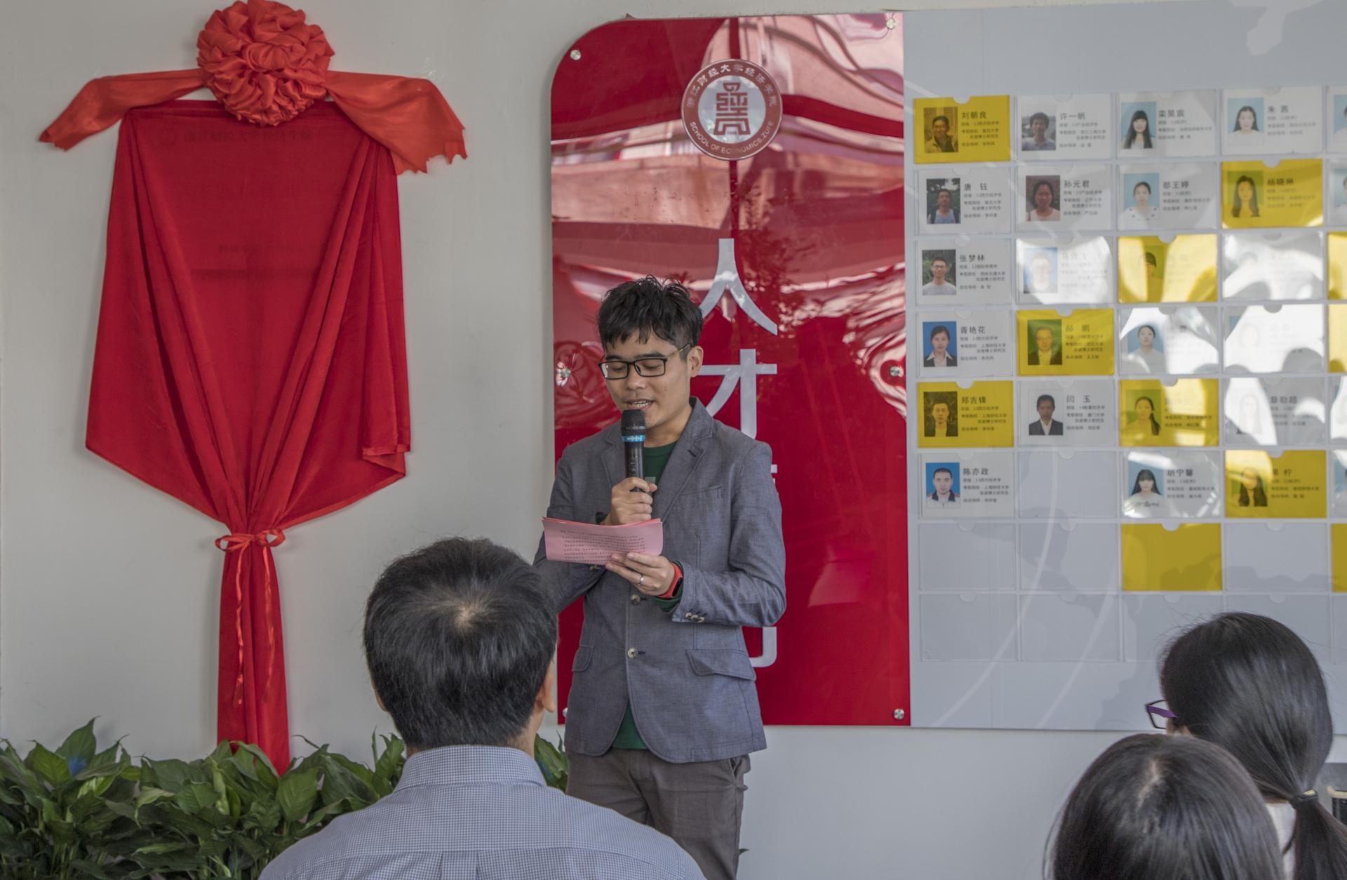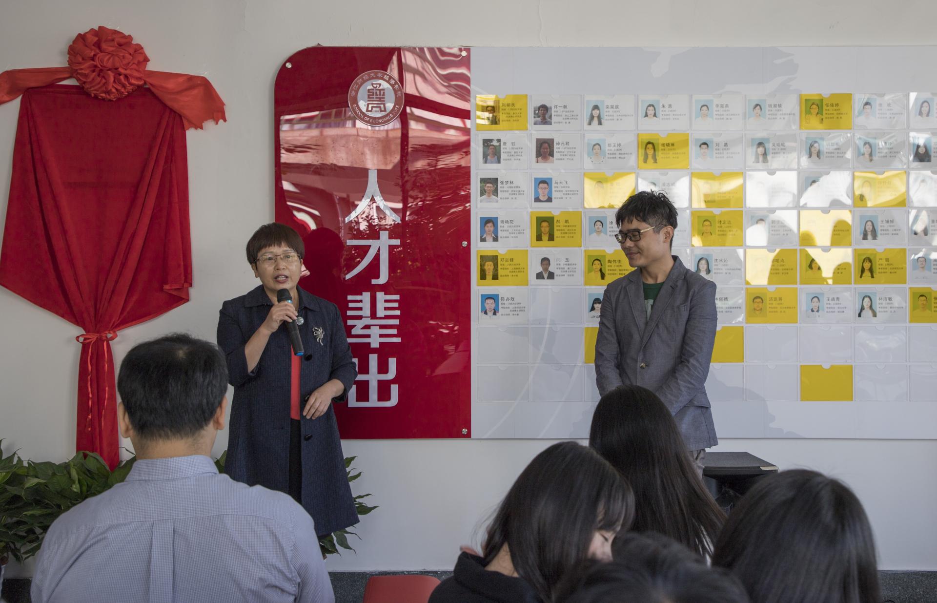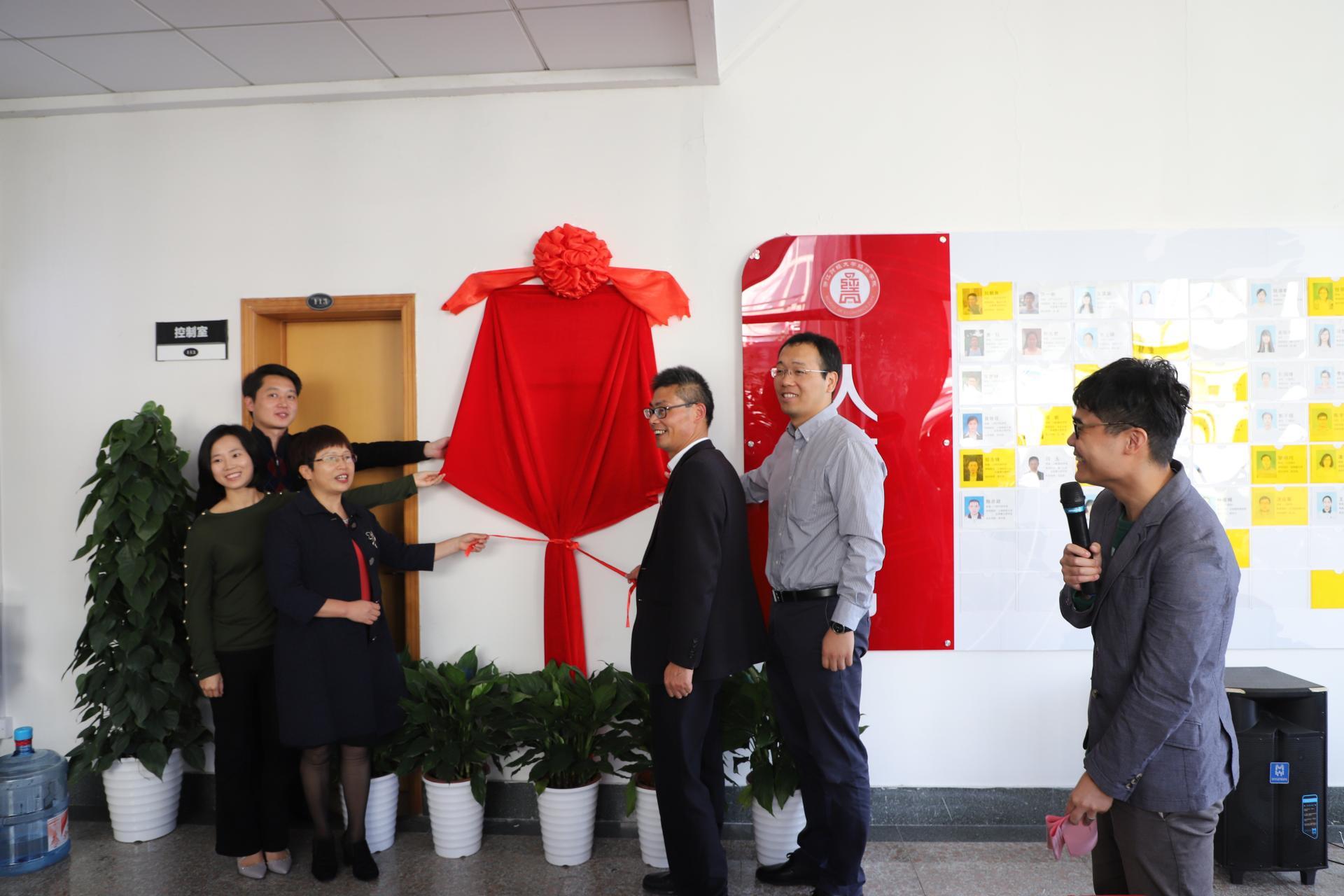 院长胡亦琴、学院党委书记沈水法、校团委副书记杨忍、环球360管理系统入口校友会会长金鑫、上海校友分会副会长余忠娜共同为学创中心揭幕。当红绸缓缓揭下,锃亮的牌匾展现在眼前,大家投以凝重肃穆的目光和热情的掌声,将这一历史性时刻铭记心间。