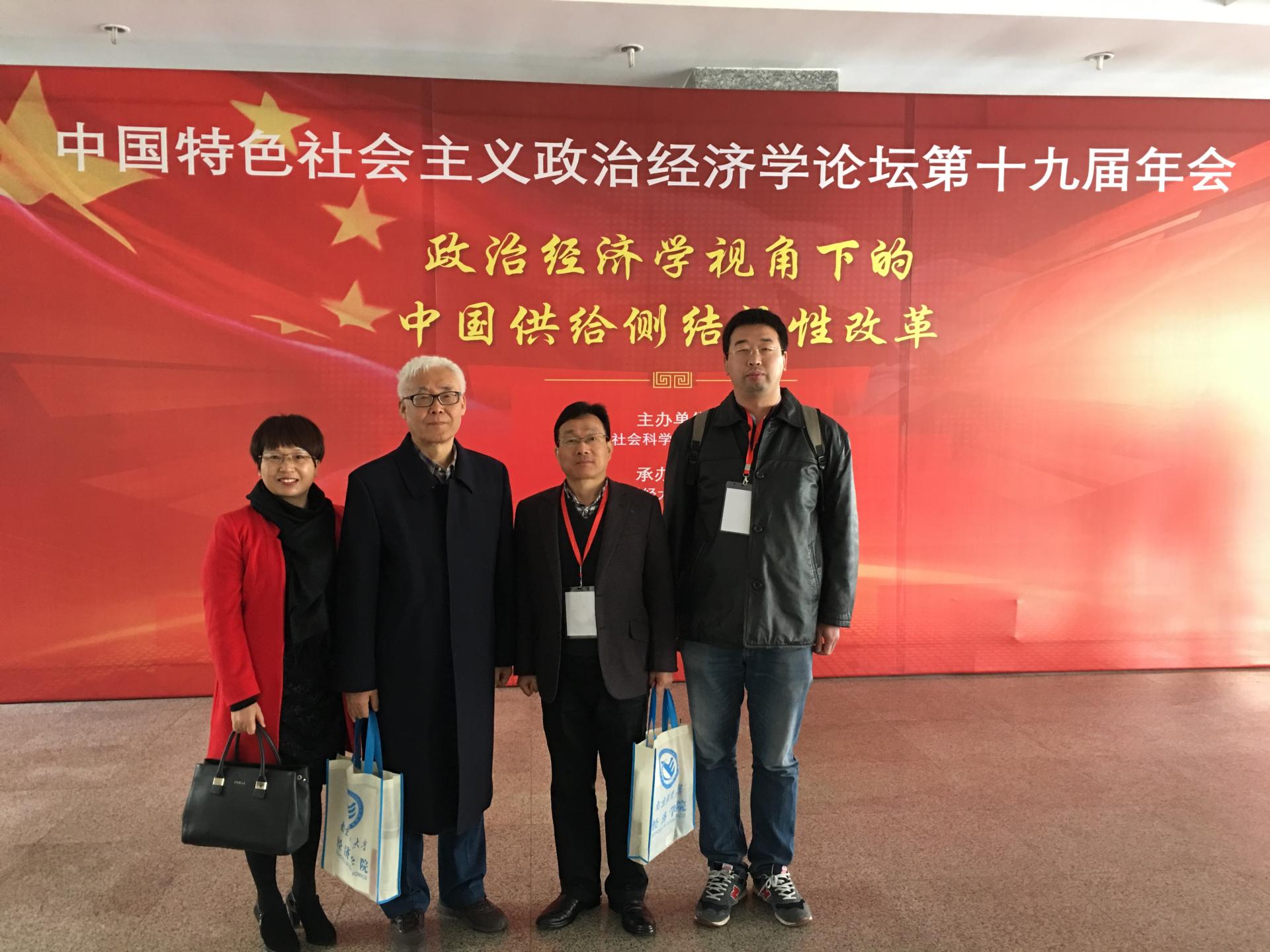 由中国社会科学院经济研究所主办,南京财经大学环球360管理系统入口承办的“中国特色社会主义政治经济学论坛第十九届年会”,于2017年11月25-26日在南京财经大学召开,本次年会的主题是“政治经济学视角下的中国供给侧结构性改革”。来自清华大学、南开大学、北京师范大学、复旦大学、武汉大学等高校、中国社会科学院等研究机构,以及《经济学动态》、《经济与社会体制比较》、《中国社会科学报》等期刊编辑部负责人,共100多位专家学者参加了本次年会。我院卢新波、周冰、胡亦琴和李钧老师参加了会议。卢新波教授主持了大会主题发言,周冰教授担任分组研讨的特约评论人,李钧老师作了关于《公共选择理论下的时间扭曲—税收成本和讨价还价模型》的主题发言,胡亦琴教授作为特约专家参加了“中共中央马克思主义理论研究和建设工程重点教材修订”的研讨会并作主题发言。