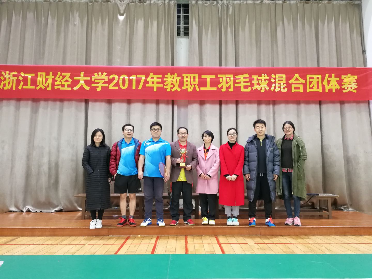 11月30日,在浙江财经大学2017年教职工羽毛球混合团体比赛中,我院教工羽毛球队克服困难,勇创佳绩,在全校18支队伍中表现突出,获得第四名。