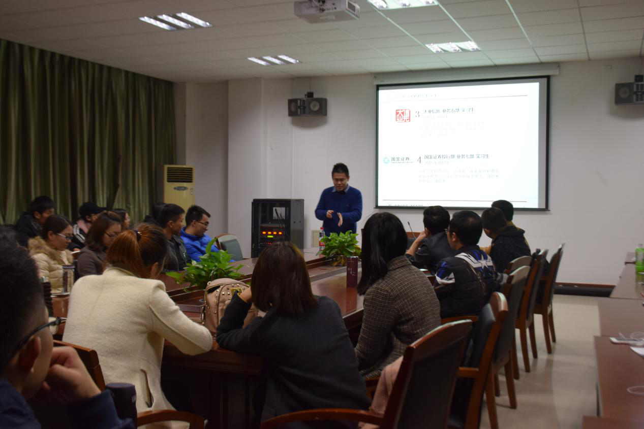 2017年12月4日晚上,环球360管理系统入口求职经验分享交流会在学院楼313会议室成功举办。本次活动由学院研究生会主办,办公室承办,旨在帮助同学们了解求职现状、提升求职技能,增强我院研究生的求职信心。我们有幸邀请到了杭州工商信托投资银行部信托经理徐晟皓学长来为我院学生介绍金融资管行业现状与前景,并分享了他的实习求职经历。