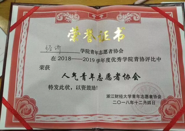 12月4日下午,浙江财经大学优秀青年志愿者协会评比在学术四报落下帷幕。我院青年志愿者协会在评比以总成绩第二名的好成绩喜获“优秀分会”荣誉称号,并获得“人气志愿者协会”荣誉称号。