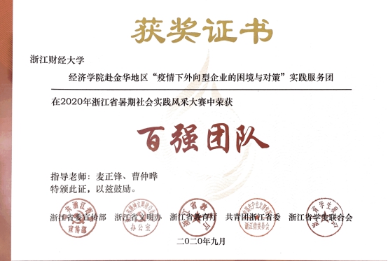 完成调研后,实践团结合所学专业知识,对调研的数据和信息做出分析,形成多份调研报告,向企业建言献策,并形成学术成果公开发表。团队还积极与各方媒体取得联系,力求将成果分享给更多关注这一话题的群体。实践进程先后被浙江新闻、青年时报、东阳日报等9家媒体报道,微博话题“识时婺者”大学生暑期社会实践阅读访问量逾12万。此外,团队还在2020年浙江省暑期社会实践风采大赛中荣获百强团队。