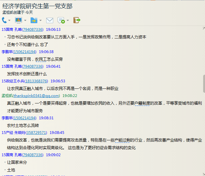 3月17日至3月20日期间,学院各支部,各班及社团邓读对两会相关热点问题进行了热烈的线上讨论,同学们积极参与,通过QQ群,微信群对就业、高等教育、创新创业、民生等问题进行了交流。其中,第二党支部对两会中“大众创业,万众创新”的话题进行了讨论,指出拥有了众创的平台才能使创新意识和作品有更好的展现空间,也对学校建设创新创业型大学,进一步培养学生创新意识表示支持。第三党支部重点关注了两会中与杭州相关的一些话题,如杭州医改政策,杭州发展模式和G20峰会等,从身边热点出发,具有敏锐的洞察力。研究生第一党支部凭借专业知识对供给侧改革进行热议。在各班讨论中,14经济一班查询了中青舆情检测室检测两会相关信息的数据,显示出国民对两会的关注热度。15国民经济的同学对两会中的“中等收入陷阱”提出了自己的意见。邓小平理论读书协会重点关注了两会中的“中国制造+互联网”,指出通过产品创新走向“中国智造”。