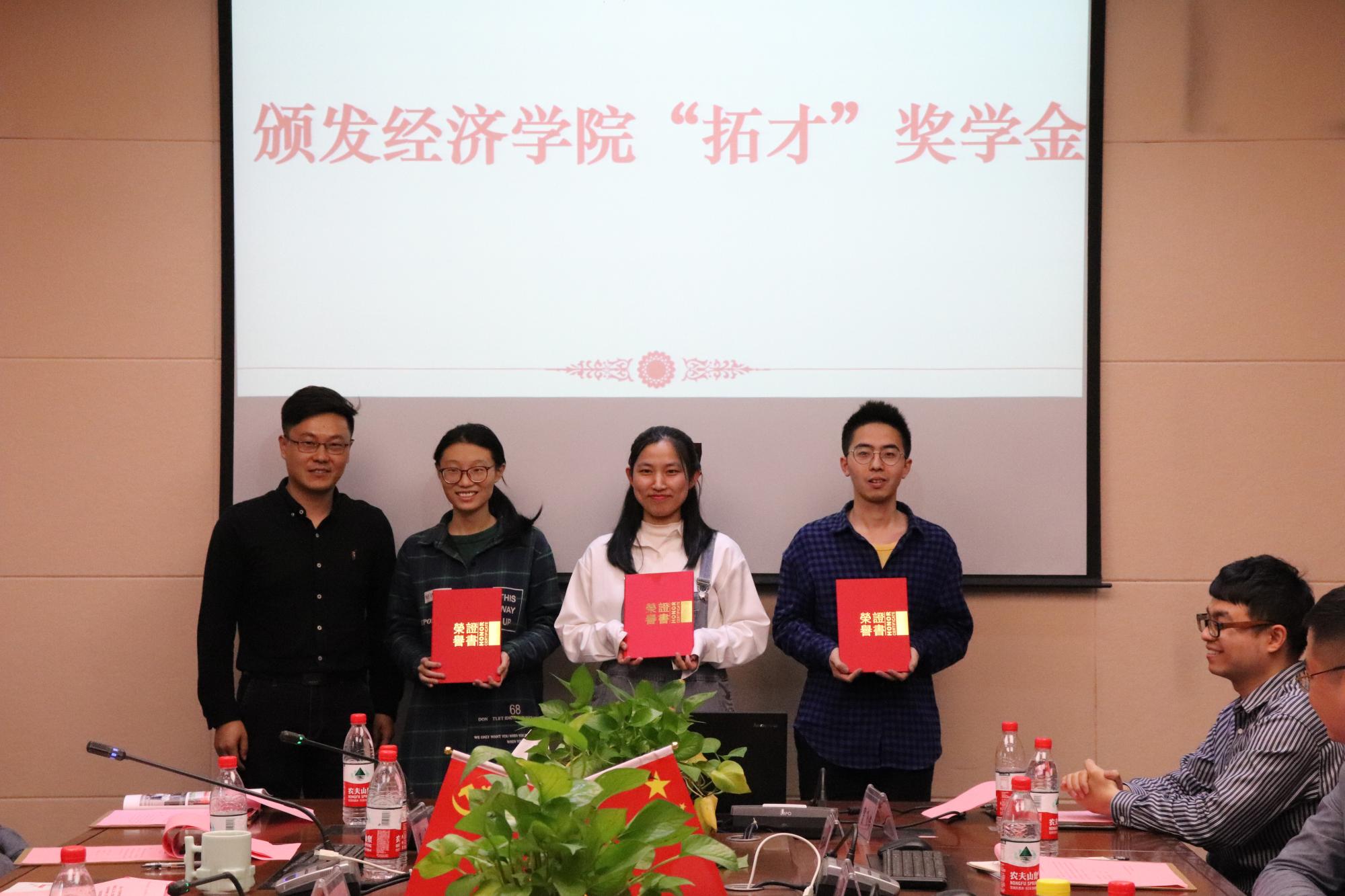学院在210会议室举行“拓才”奖学金颁奖仪式。“拓才”奖学金由学院03东方国贸2班校友共同出资捐赠,奖励资助学院在学科竞赛、学术研究、创新创业项目中获得优异成绩的家庭经济困难学生。校友的资助让同学们更深刻的感受到学院精神的力量所在,更加鼓舞同学们学会感恩,勤奋求学,努力成才。